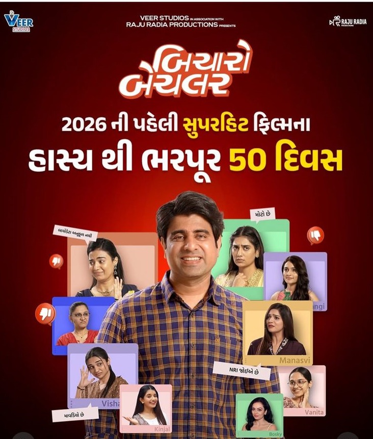 વીર સ્ટુડિયોઝ દ્વારા અને રાજુ રાડિયા પ્રોડક્શનના સહયોગથી નિર્મિત ગુજરાતી ફિલ્મ ‘બિચારો બેચલર’ એ બોક્સ ઓફિસ પર સફળતાપૂર્વક 50 દિવસ પૂર્ણ કરીને 2026ની પહેલી સુપરહિટ ફિલ્મ તરીકે પોતાનું સ્થાન મજબૂત બનાવ્યું છે. 1 જાન્યુઆરી, 2026ના રોજ રિલીઝ થયેલી આ ફિલ્મે સાત અઠવાડિયા પછી પણ થિયેટરોમાં પોતાની પકડ જાળવી રાખી છે